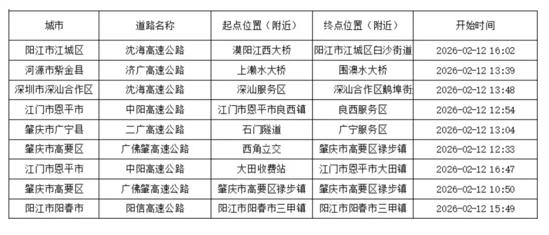 截至2026年2月12日17时,全省高速通行缓慢长度超过5公里,时间超过30分钟的点段共9个,在河源市1个、江门市2个、阳江市2个、深圳市1个、肇庆市3个。