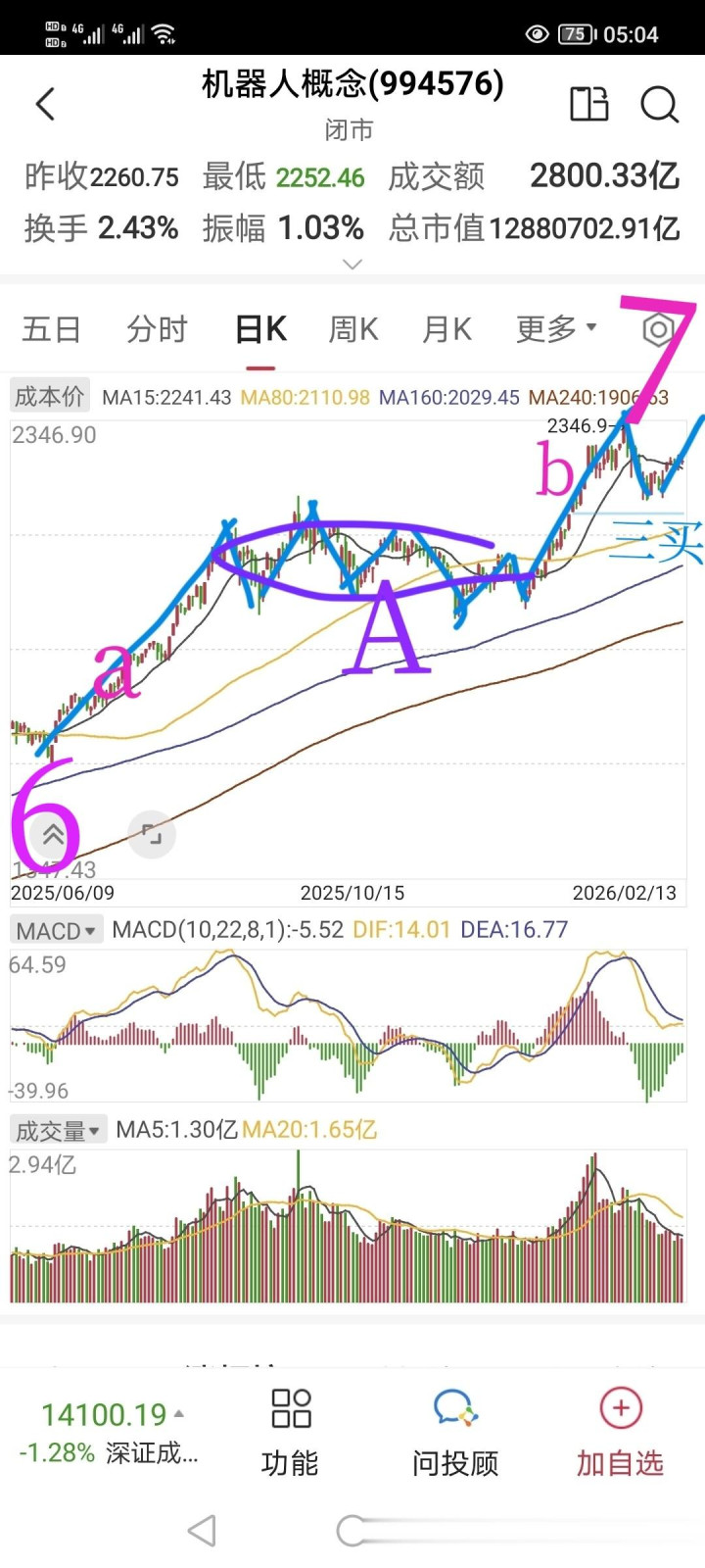 上图为日线。周线的67,在日线上是一个标准的缠论a+A+b的盘整走势,当下正在三买点确认后的上涨中。即使借这次春晚上的惊艳创2346新高,也是背驰走势,大概率要围绕2346构造第二个上涨中枢B,然后再走一次背驰,最终完成67。另外还有一个版本就是,节后借春晚表演机会再向上冲一冲,不创2346新高,然后直接下来,进入到前方A中枢,完成中枢扩展。把A中枢直接扩展成周线中枢,这个走势的概率还是不小的。