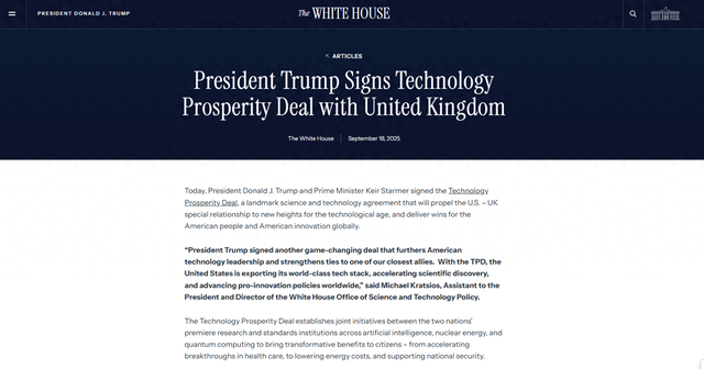 随后,特朗普和斯塔默签署了一项《科技繁荣协议》,共同努力开发用于医疗保健的人工智能模型,扩大量子计算能力,简化民用核项目。