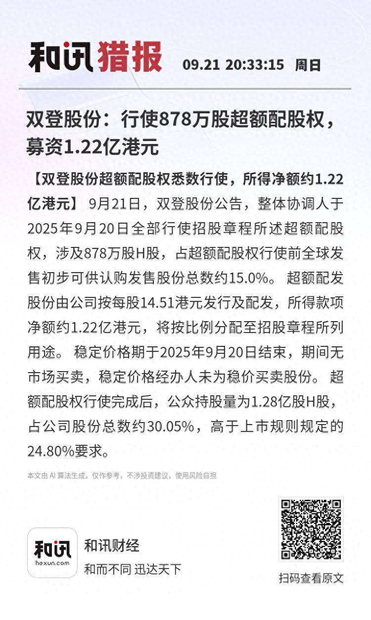【双登股份超额配股权悉数行使,所得净额约1.22亿港元】9月21日,双登股份公告,整体协调人于2025年9月20日全部行使招股章程所述超额配股权,涉及878万股H股,占超额配股权行使前全球发售初步可供认购发售股份总数约15.0%。 超额配发股份由公司按每股14.51港元发行及配发,所得款项净额约1.22亿港元,将按比例分配至招股章程所列用途。 稳定价格期于2025年9月20日结束,期间无市场买卖,稳定价格经办人未为稳价买卖股份。 超额配股权行使完成后,公众持股量为1.28亿股H股,占公司股份总数约30.05%,高于上市规则规定的24.80%要求。